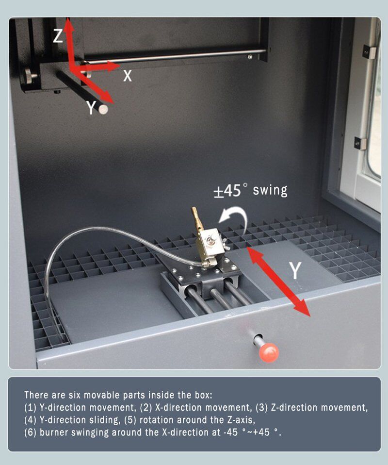 | Movable direction | (1) Y-direction movement (2) X-direction movement (3) Z-direction movement (4) Y-direction sliding (5) rotation around the Z axis (6) burner swinging around the X direction -450~+450. |