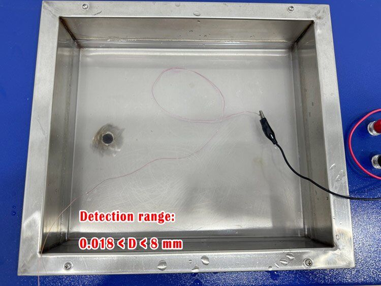 7. Heat the sample according to the regulations and cool it to room temperature without bending or stretching. Then connect one end of the sample to a black terminal (negative electrode) and place it in a solution tank (positive electrode). The other end of the sample should be exposed to the solution. Activate the “Test” button, and the buzzer will sound an alarm when the time is up. You can observe with normal vision, record the number of pinholes, and press the “Test” button again to reset to standby mode.