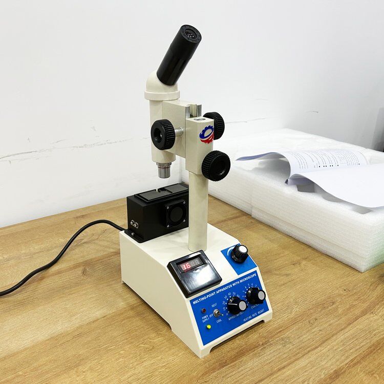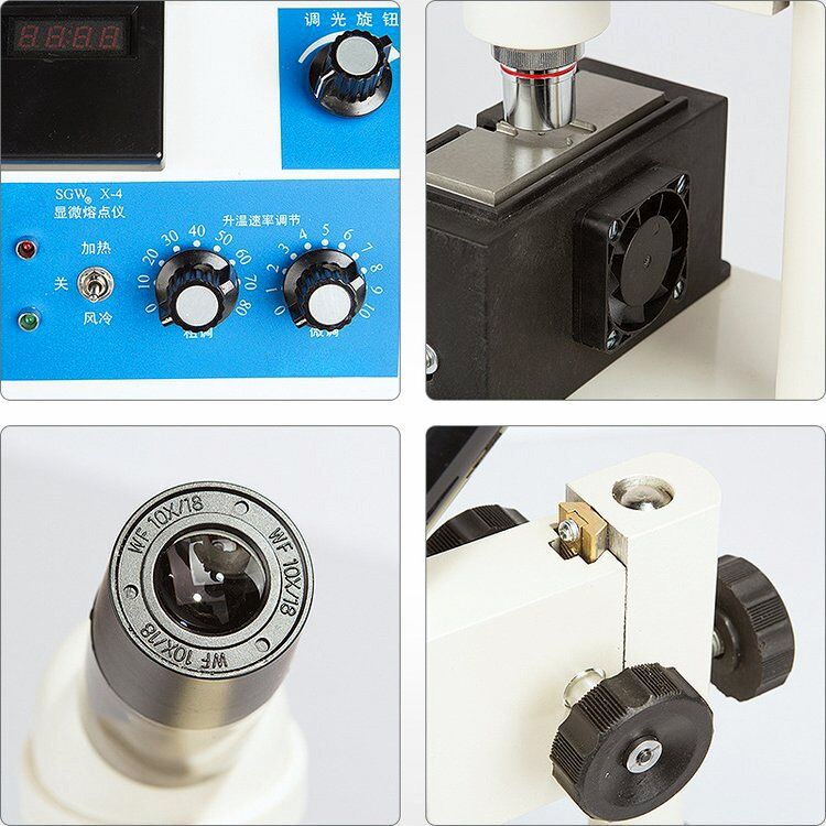 This instrument is a microscope, heating stage for the integration of the structure, temperature detector for the built-in type easy to use, the microscope is used to observe the sample heat reaction changes and the whole process of melting. The heating stage is heated by an electric wire with a fan, which can quickly cool down the temperature and can be used to measure the melting point by slide method or by capillary tube.