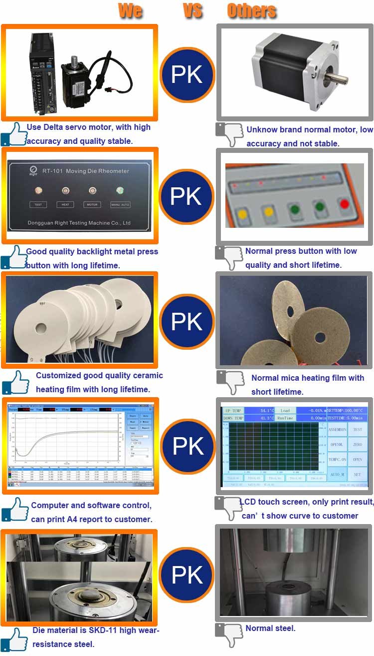 RT-101 Moving die rheometer controlled by computer, the computer setting the parameters of the direct control of test parameters rheometer. Display real-vulcanization curve and temperature curve, store test results, and different adjustable comparisons of test results in different colors.