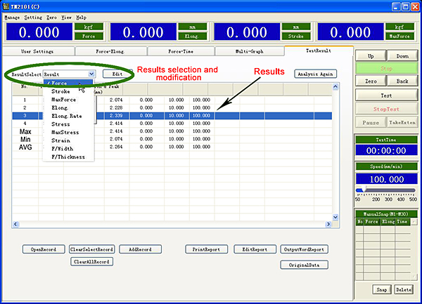Adopted photoelectric encoder to measure the displacement, the controller uses the embedded single-chip microcomputer structure with multi-function software, which combined with measurement, control, calculation and storage. It can automatic calculate the stress, rate of elongation (need to add with extensometers), tensile strength, elastic modulus, automated statistical results; automatically recorded the biggest point, breaking point, the designated point value or the rate of elongation; Using computer to display the dynamic curves in the testing process and process the data, After testing, it can re-analysis and editing the data by amplifying the curves through the graphics processing module, printing reports, product performance reached the international advanced level.