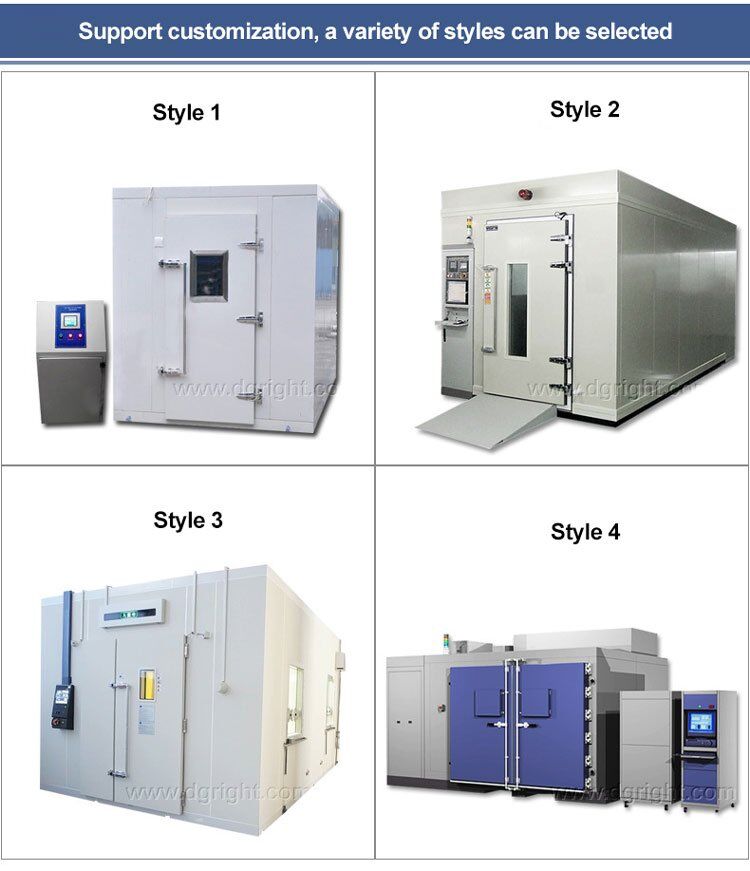 Walk-in constant temperature and humidity test room is specially suitable for whole machine and large parts to do low temperature test, high temperature test, high and low temperature change test, constant temperature and humidity test, high temperature and low temperature test with humidity change test and so on.To provide a large temperature and humidity test room for testing big size parts, semi-finished product and finished product, at the same time, also be applied in testing large quantity or big size equipment, such as computer terminal, auto parts, etc.The test room is mainly consist of control panel, distributor, moisturizing base plate blower, heater, humidifier, refrigerating unit.We also can custom the size chamber size and function, according to customers’ standard and requirement.Block type appearance,beautiful shape,scientific design,can meet customers’ different requirement.