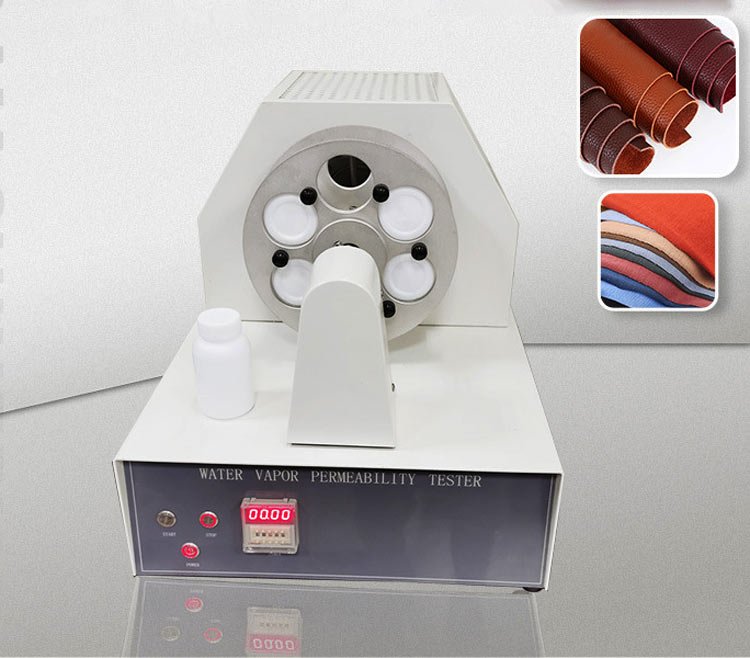 Leather Vapor Permeability Tester fix the circular test piece on the opening of a test bottle containing a certain amount of solid desiccant of the water vapor penetration testing machine, so as to use the test piece to separate the desiccant in the bottle from the air outside the bottle, and then turn on the water The vapor penetration tester rotates the test bottle and the fan that makes the air turbulence rotate. The continuously moving desiccant continuously absorbs the water vapor passing through the test piece. Within a certain period of time, the mass of the water vapor absorbed by the test bottle desiccant is weighed. To evaluate the water vapor permeability of the test material.