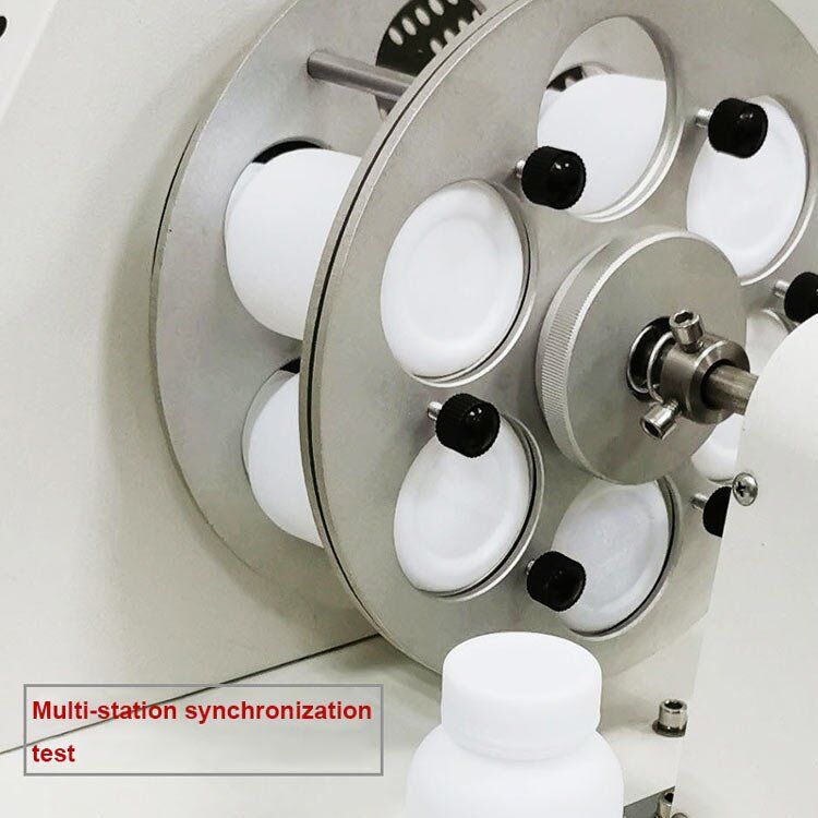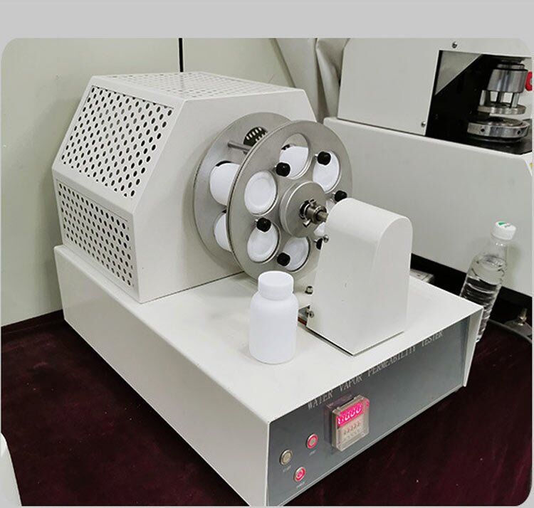 Leather Vapor Permeability Tester fix the circular test piece on the opening of a test bottle containing a certain amount of solid desiccant of the water vapor penetration testing machine, so as to use the test piece to separate the desiccant in the bottle from the air outside the bottle, and then turn on the water The vapor penetration tester rotates the test bottle and the fan that makes the air turbulence rotate. The continuously moving desiccant continuously absorbs the water vapor passing through the test piece. Within a certain period of time, the mass of the water vapor absorbed by the test bottle desiccant is weighed. To evaluate the water vapor permeability of the test material.