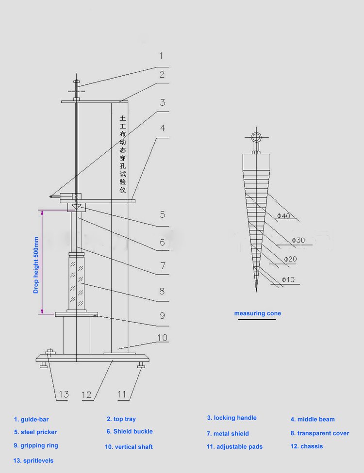 It is used to measure the penetration ability of steel cones of Geotextiles and related products when they fall from a fixed height.