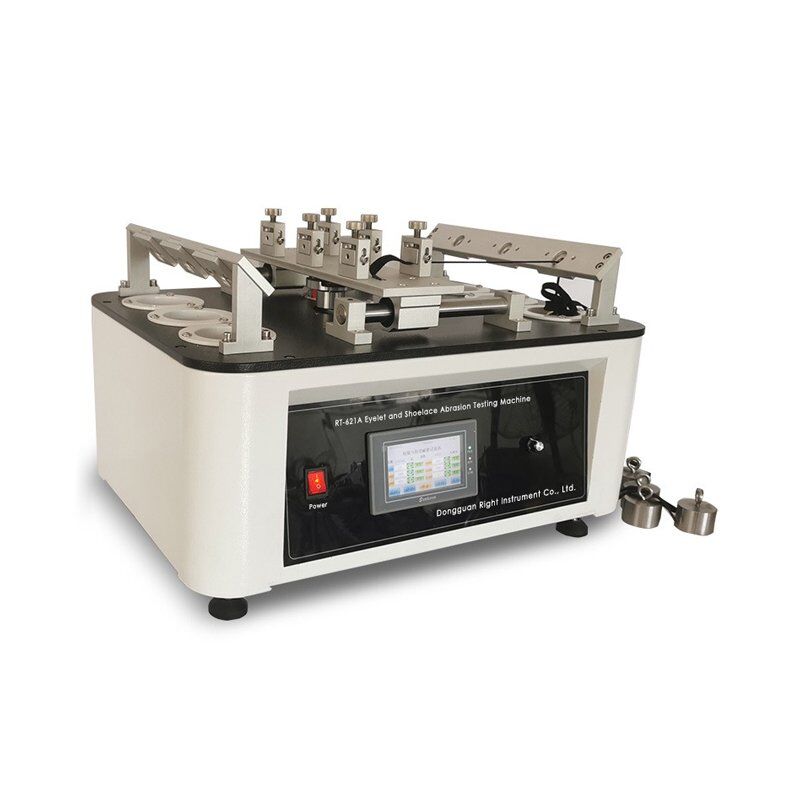 SATRA TM93 6 Group Shoe Hole Eyelet and Shoelace Abrasion Testing Machine passes a section of the shoelace through a shoe eye held by a fiberboard. The shoelace is bent 90 degrees through the shoe eye, and the two parts of the fiberboard and shoelace are each at a 45-degree angle. Then, the shoelace is tightened under a standard load and repeatedly pulled back and forth through the shoelace.